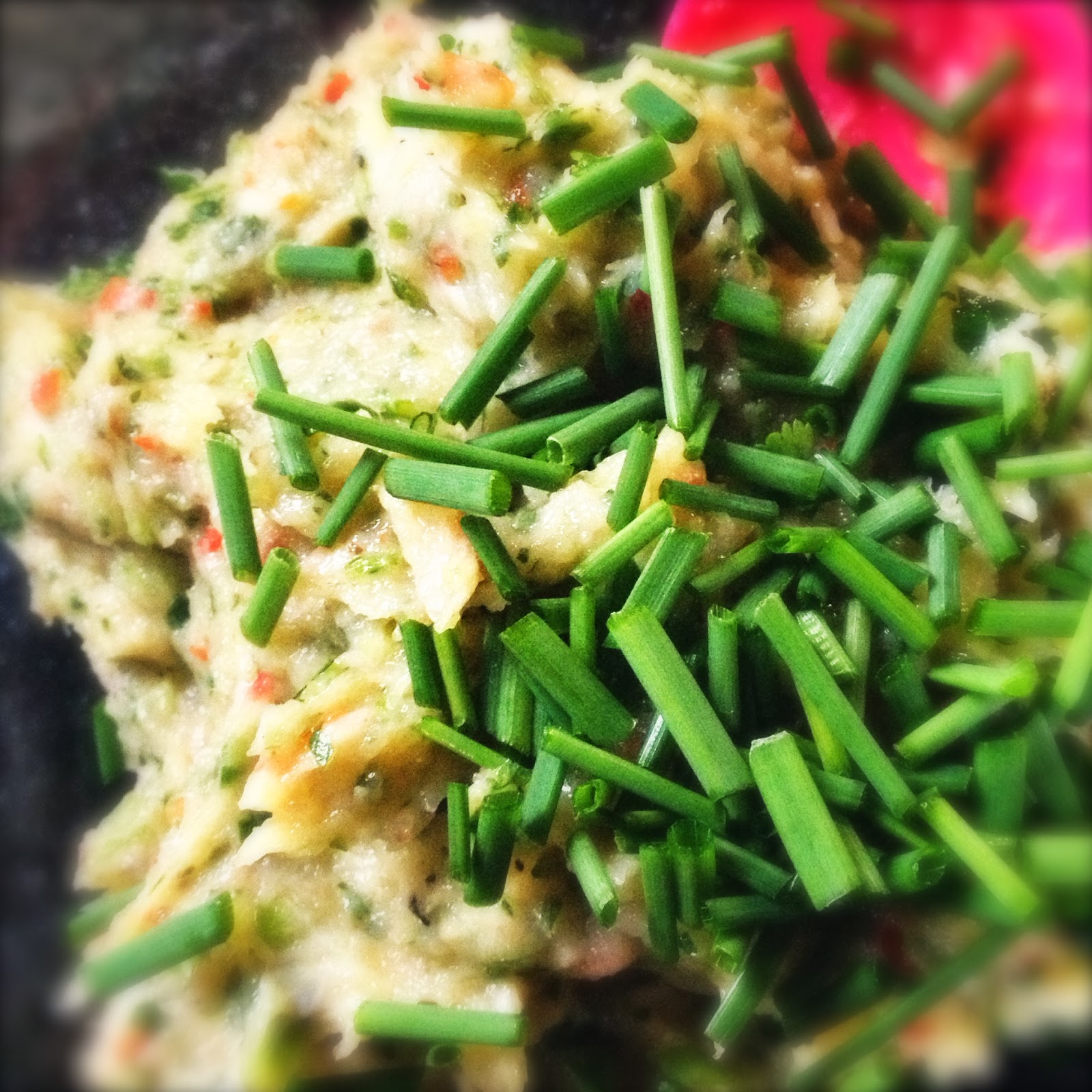 Cut the cod into small chunks. Chop the chilli and garlic and spring onion into small pieces. Then pop all the ingredients for the fishcakes except for the chives into a food processor.